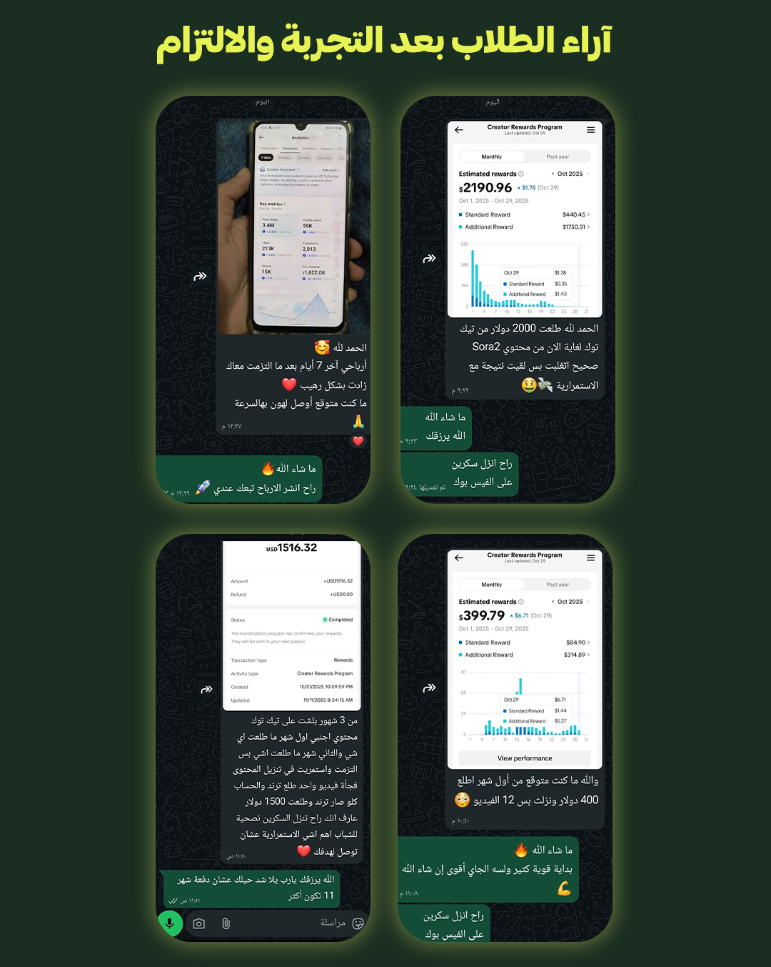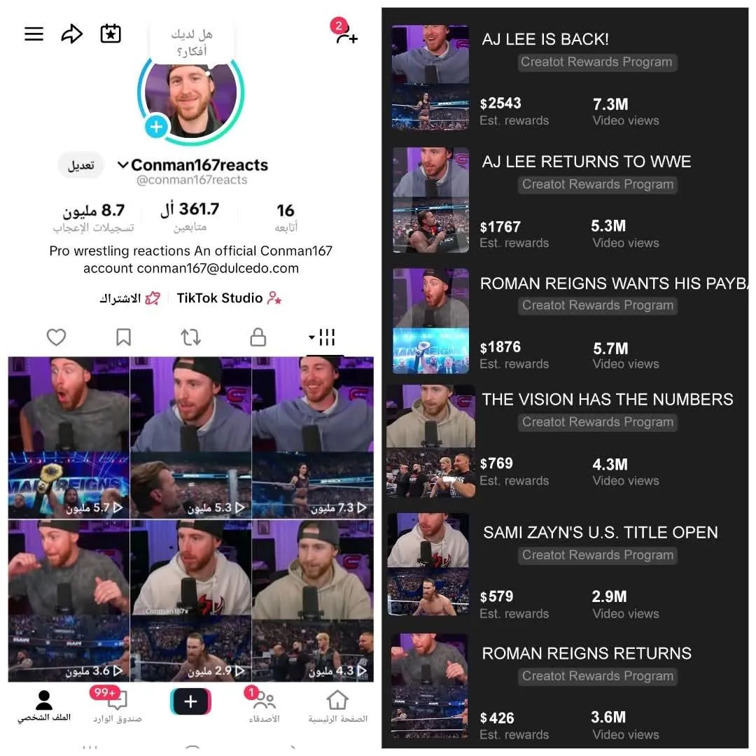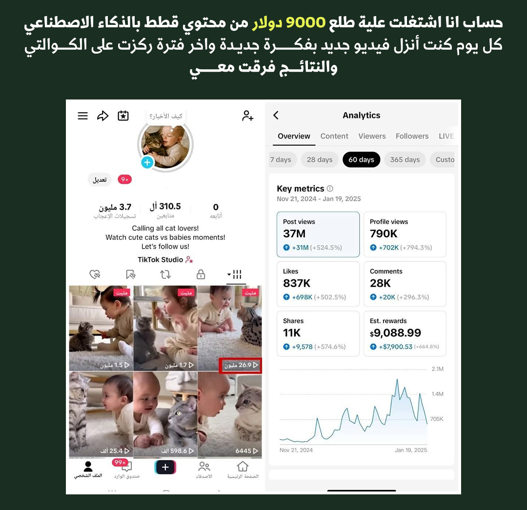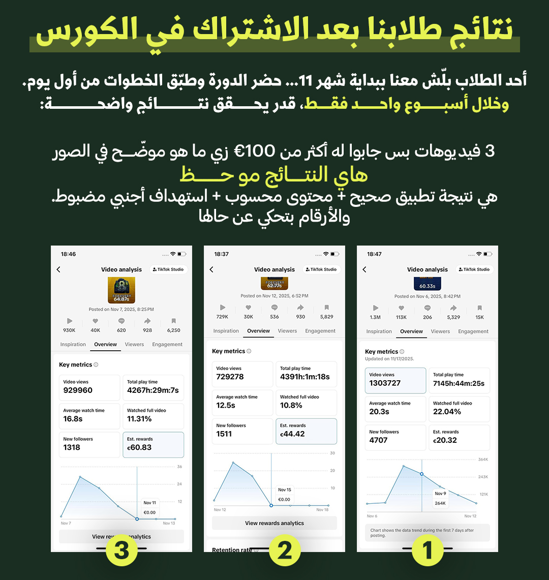 وهون كانت الصدمة 90% من النجاح بيعتمد على المحتوى الصح مش على الحساب، ولا عدد المتابعين، ولا الشهرة. لما بلشت أطبّق صح الفيديوهات بلشت تضرب والأرباح بلشت توصل بشكل يومي ووقتها فهمت إنه الموضوع مش حظ الموضوع طريقة و نظام و فكرة صح.